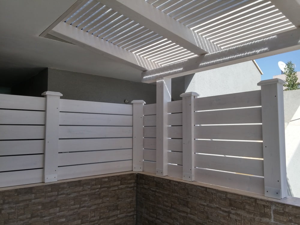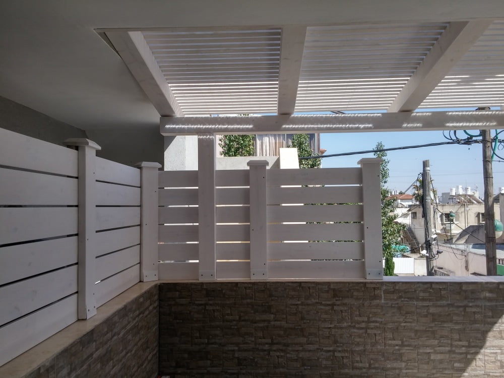 פרגולה גושנית עם קורות 15/15 הצללה וגדר דקורטיבית